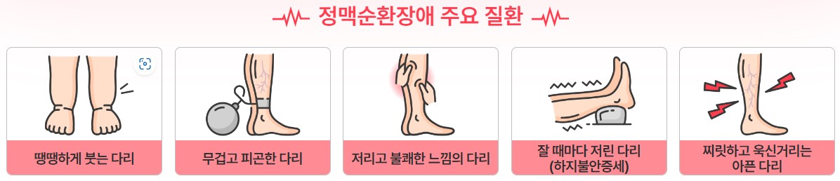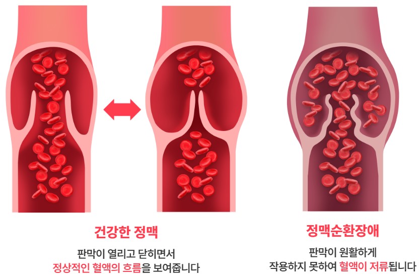 정맥 순환 장애란 정맥의 탄력이 떨어지고, 정맥의 판막이 정상적으로 작동하지 못하여 혈액과 체액이 심장 쪽으로 흐르지 못하고 손과 발에 고여서 발생하는 질환입니다. 노화 또는 다른 질환 등에 의해 정맥 순환 장애가 발생할 수도 있지만, 장시간 서있거나 앉아있는 경우 혈액이 심장으로 돌아가지 못하고 다리 정맥에 저류되어 다리가 붓고 아프고 무겁게 느껴지는 증상이 나타날 수 있습니다.