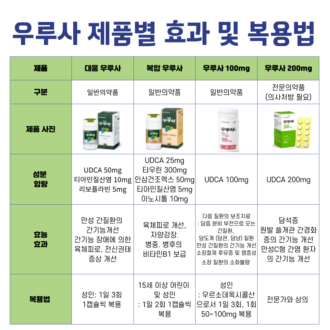 현재 판매되고 있는 우루사 제품에는 UDCA 단일성분인 제품도 있고, 비타민 B 및 인삼, 타우린 등 피로 회복을 돕는 물질이 UDCA와 함께 복합제 형태로 포함되어 있는 제품도 있습니다. 제품별로 UDCA의 함량 및 포함된 성분이 다르기 때문에 제품별 효과 및 복용법이 다릅니다. 아래 표에 우루사 각 제품별 효과 및 복용법을 정리하였으니, 복용 전에 꼭 참고하여 주십시오.